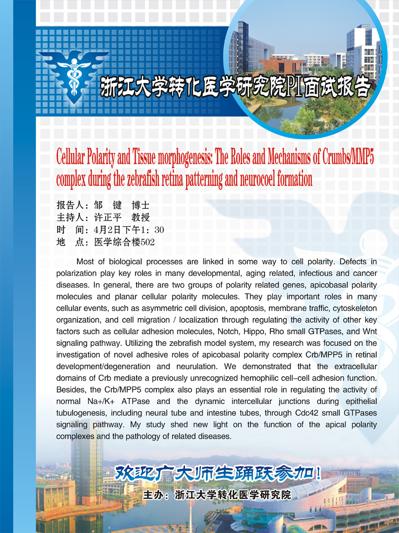 Northwestern University 邹键博士学术报告——Cellular Polarity and Tissue morphogenesis: The Roles and Mechanis