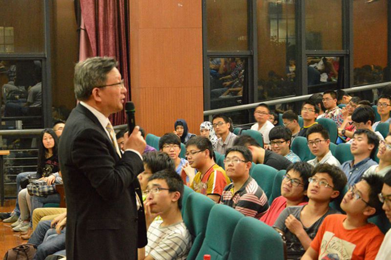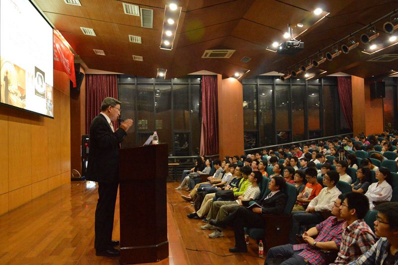 宣誓仪式后是邵逸夫医院蔡秀军院长的“创新与外科发展”讲座。蔡秀军院长首先围绕外科学的发展史,向我们介绍了外科进步的重重里程碑,从解剖学的出现到止血术的成熟,从巨创手术到现在的微创手术,外科经历了七个世纪的风雨走到今天,不仅外科的格局发生了改变,整个医学模式也在不断地更新变化。现代医学正处于从生物医学向生物-心理-社会医学模式转变的时期,新的医学模式也造就了新的医患关系模型。想要在新医学模式下治疗疾病又减少机体心理与生理的创伤,微创外科的出现恰好能够满足这一追求。随后蔡秀军院长向大家介绍微创外科的发展与进步,结合自身的研究与发现,展示了邵逸夫医院在此领域的先进技术。同学们被蔡秀军院长的精彩讲说所深深吸引,无不为蔡秀军院长和邵院的成就所震撼。蔡秀军院长寄语:不要走他人已经走过的路,因为道路只能引导你到达他人能到的地方。讲座结束后,叶旭军书记向蔡秀军院长赠送“名医名师大讲堂”纪念牌以示感谢。