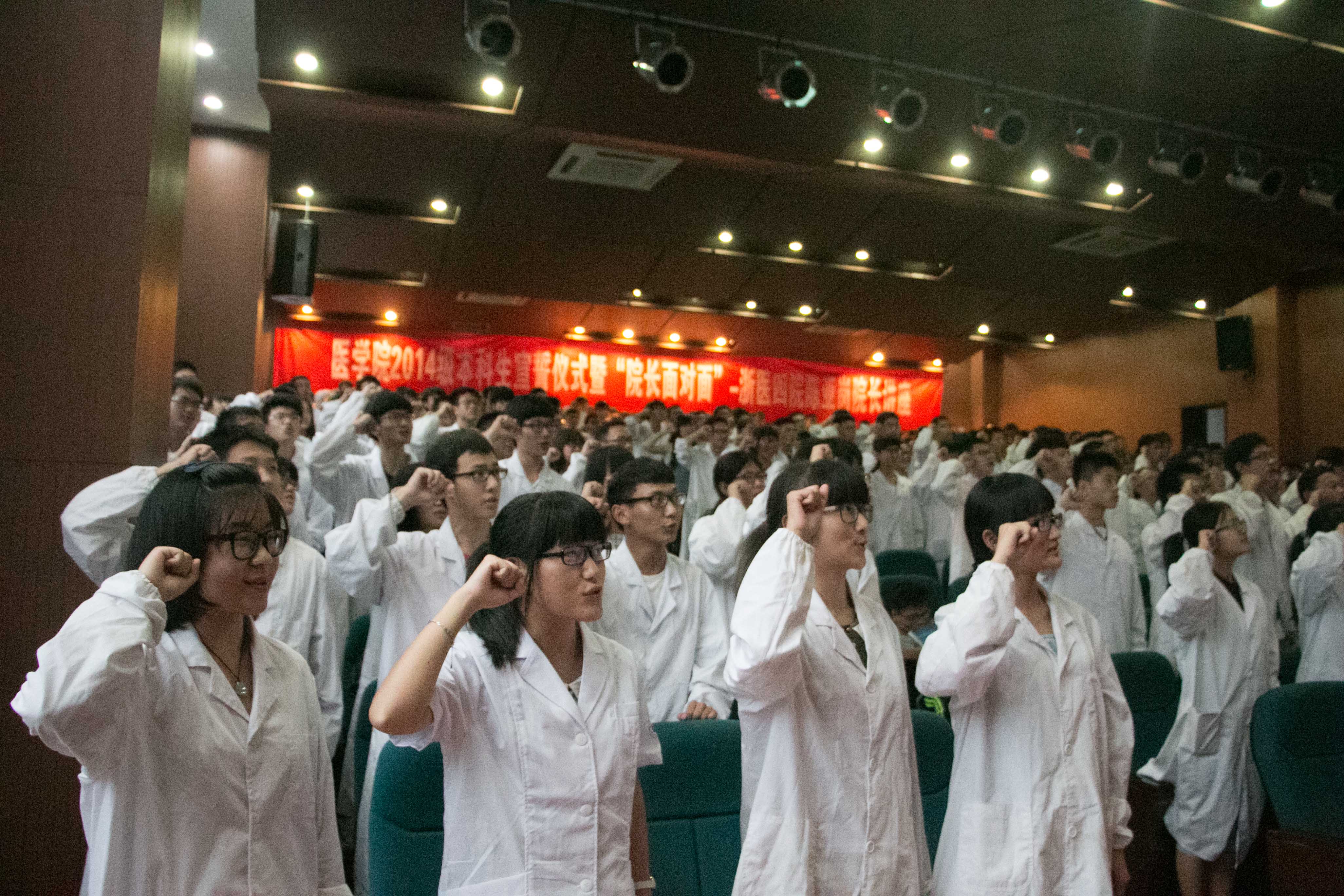 随后,2014级的医学生们身着白大褂,举起右手,在陈书记的带领下庄严宣誓。“健康所系,性命相托。”铿锵有力的宣誓声回荡在辅楼报告厅里,每位同学的心中从此多了一份对世人、对自己的承诺,他们也必将穷尽自己一生的努力去追求去遵守。