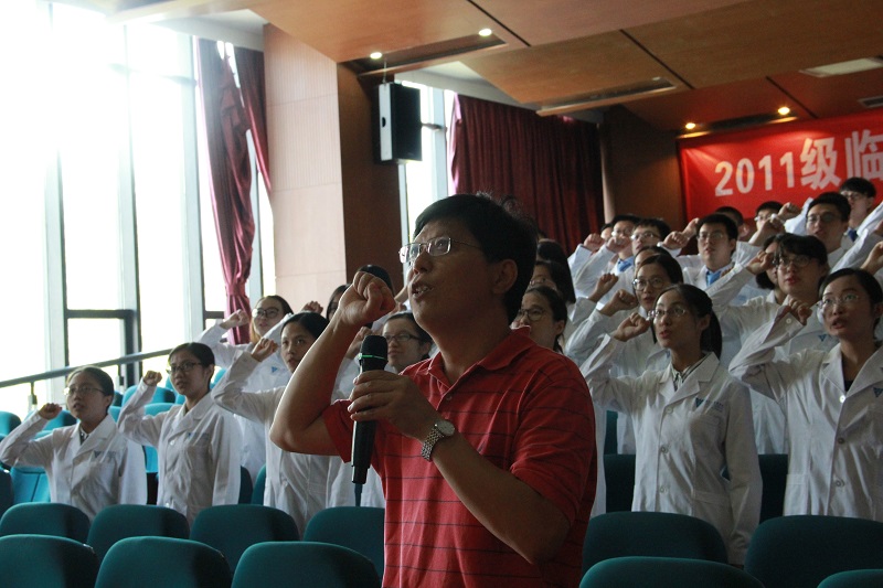 在鼓舞人心的音乐声中,捐赠者杜立中院长亲自为两位2011级临床医学八年制学生代表授予并穿上了白大褂。紧接着,其余2011级临床八年制学生也有秩序地上台,接受杜立中院长等领导亲自授予的白大褂。随后,在陈书记的带领下,身着白大衣的全体学生进行了庄严的宣誓:健康所系、生命相托,我志愿献身医学,决心竭尽全力除人类之病痛……宣誓标志着他们完成了神圣的转变,把医学生的责任放在了肩上。