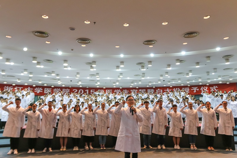 接着,举行了庄严隆重的宣誓仪式,由王伟林院长领誓,全体2015级医学生宣誓。“健康所系,性命相托”响亮而又庄严的誓词在蒙民伟楼回荡。这是每个医学生跨入医学殿堂的第一步,穿上这一身白大褂,就注定终身奉献于祖国医药卫生事业的发展和人类身心健康。