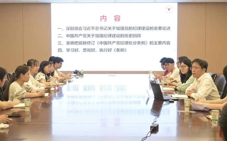 为深刻领会习近平总书记关于党纪学习教育的重要讲话精神、深入学习贯彻修订后的《中国共产党纪律处分条例》(以下简称为“《条例》”),2024年5月30日,临床医学本科生第三党支部在医学院综合楼701会议室开展党纪学习教育主题党日活动。活动邀请浙江大学医院管理办公室主任、医学院党委副书记顾国煜作党课分享。